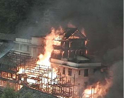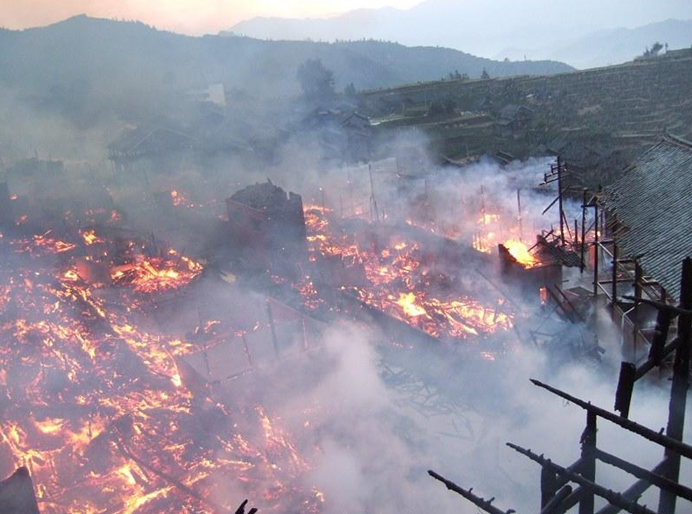 2013年3月,云南麗江古城光義街現(xiàn)文巷突發(fā)火災(zāi),燒毀民房107間;2013年4月,湖南鳳凰古城發(fā)生大火,由于消防通道狹窄無法迅速撲救,幾棟古房屋及其內(nèi)酒吧被徹底燒毀;2017年4月,古城一處街角再次發(fā)生火災(zāi);2013年8月,湖南靖州苗族侗族自治縣一古村寨發(fā)生火災(zāi),共造成58戶、248名村民房屋被燒毀;2013年10月,湖南洪江古商城清代古建筑“曾國藩兵服廠”旁一棟老民居突發(fā)大火,11戶居民無家可歸;2013年12月,洪江古商城建于清末民初的朱志大油號舊址在一次大火中付之一炬,造成22戶67人受災(zāi);頻發(fā)的火災(zāi),不僅給人民生命財產(chǎn)帶來損失,而且許多被燒毀的建筑都有上百年歷史或獨特民俗,具有較高的歷史文化價值。在廣西三江侗族自治縣,許多古村落近年來頻遭火魔侵襲,有的甚至徹底焚毀。